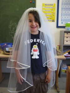 Als Felix und Frau Frauen – nun Frau Grambow – in die Schule kamen, standen die Kinder bereits Spalier. Da der Wunsch der Kinder, das Hochzeitskleid möge doch am Montag in der Schule getragen werden, sich leider nicht einrichten ließ 😉 , wurde als kleiner Trost der Schleier mitgebracht.